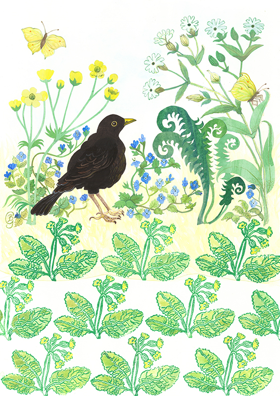 Blackbird & Wildflowers Print by Bronwen Glazzard