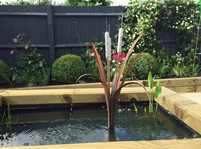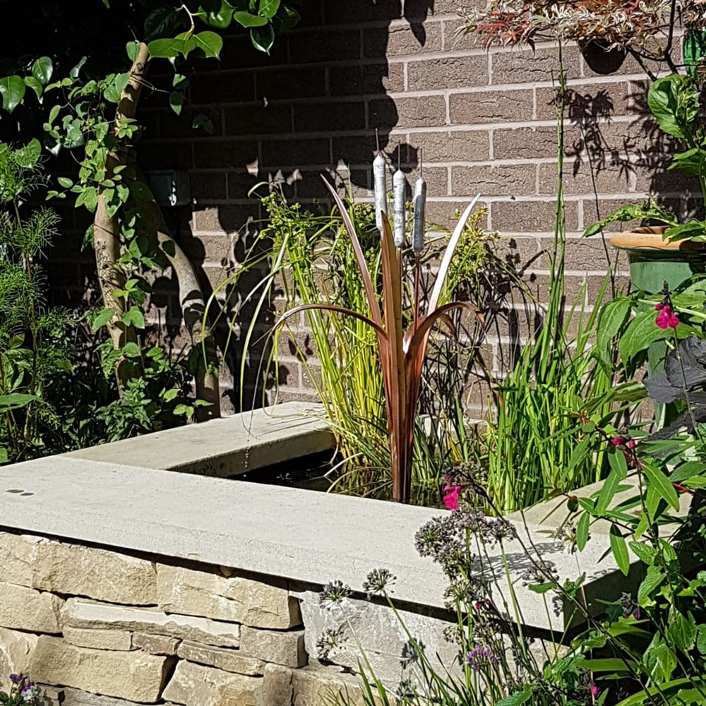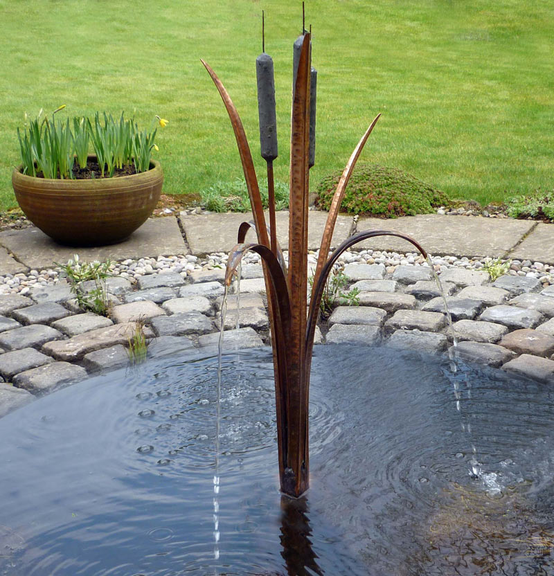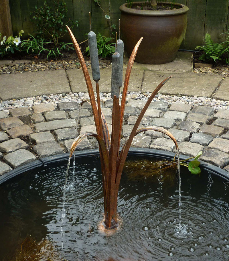 The Bulrushes copper fountain comes complete with a stone base, to enable it to sit on a plinth in a pond or pebble pool. Every piece is entirely hand made, from the strap shaped leaves to the heads of the bulrushes, which are made from copper and then plated in lead to give a contrast in both colour and texture.