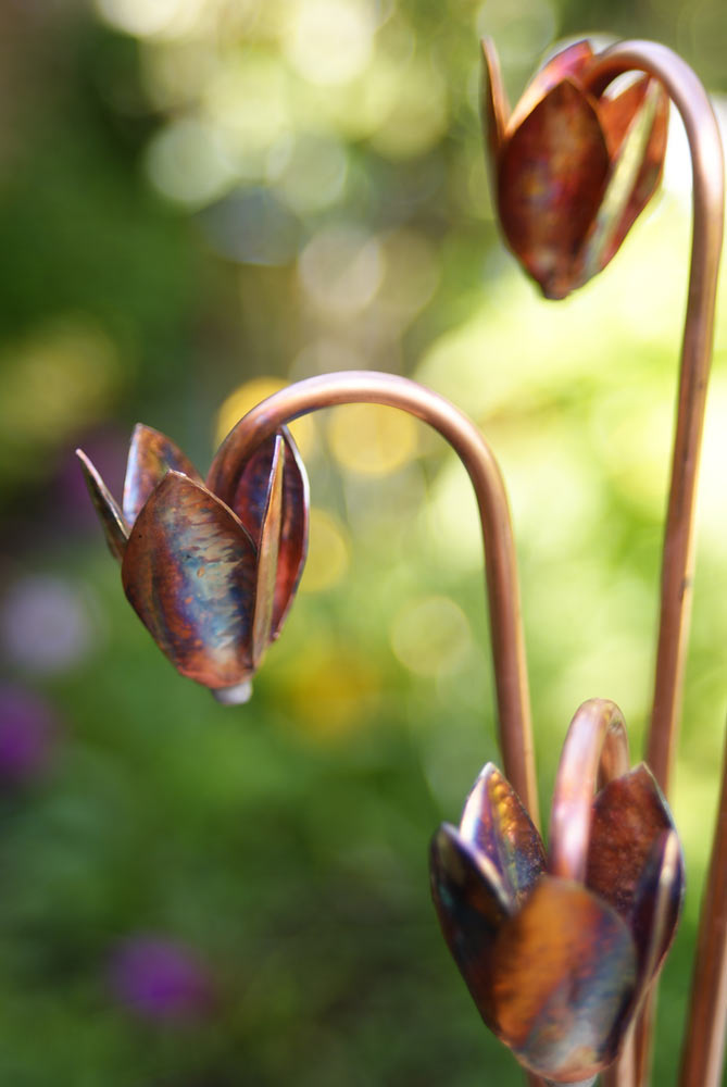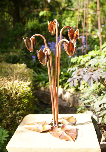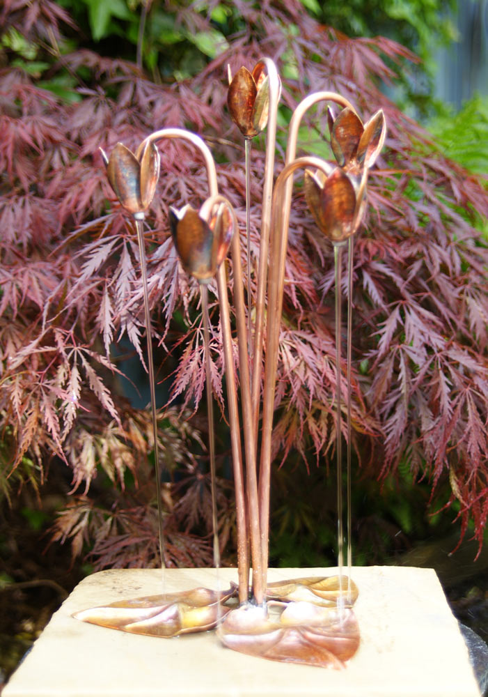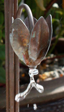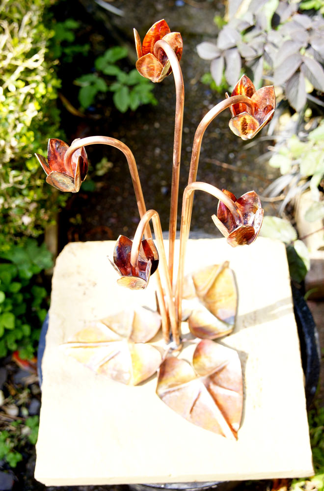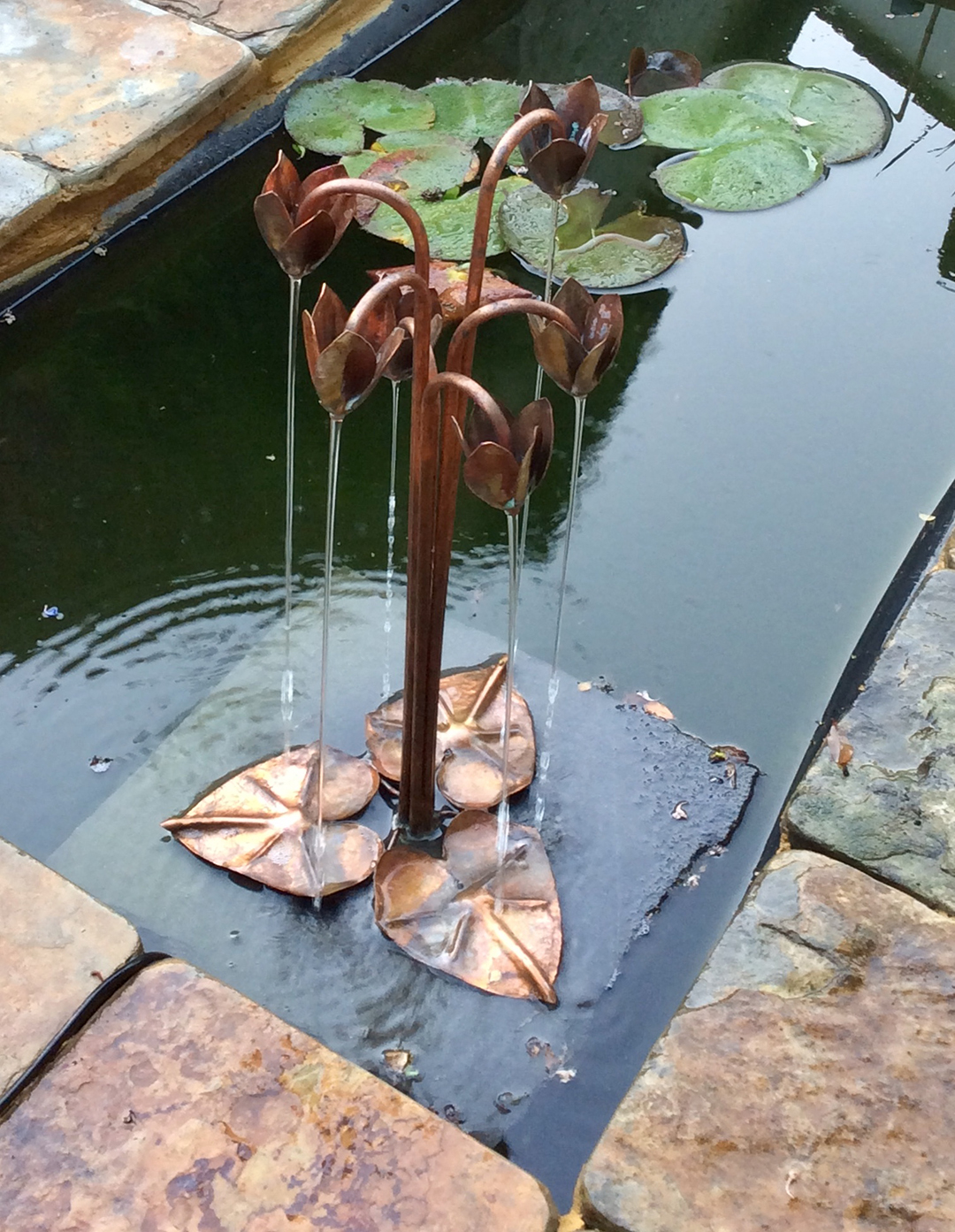 These delicate flowers make a copper fountain suitable for even the smallest of ponds. The slow trickle of water gently falls from the five flowers onto the rosette of leaves surrounding them on the base.