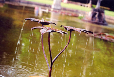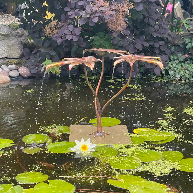 Water flows from the centre of each and pours from the tips into the water below, making many small streams. Quite a busy fountain for the size, making lots of lovely sounds.