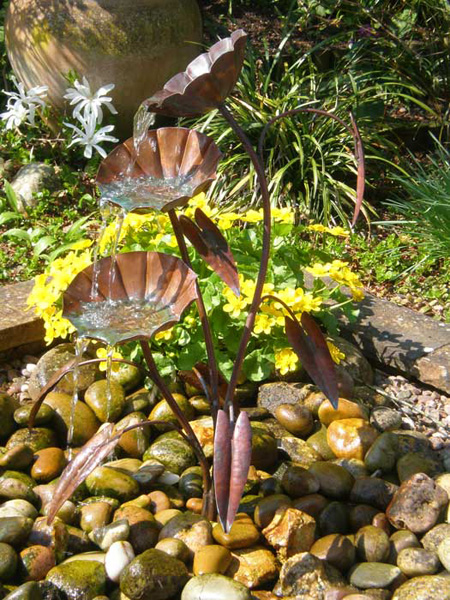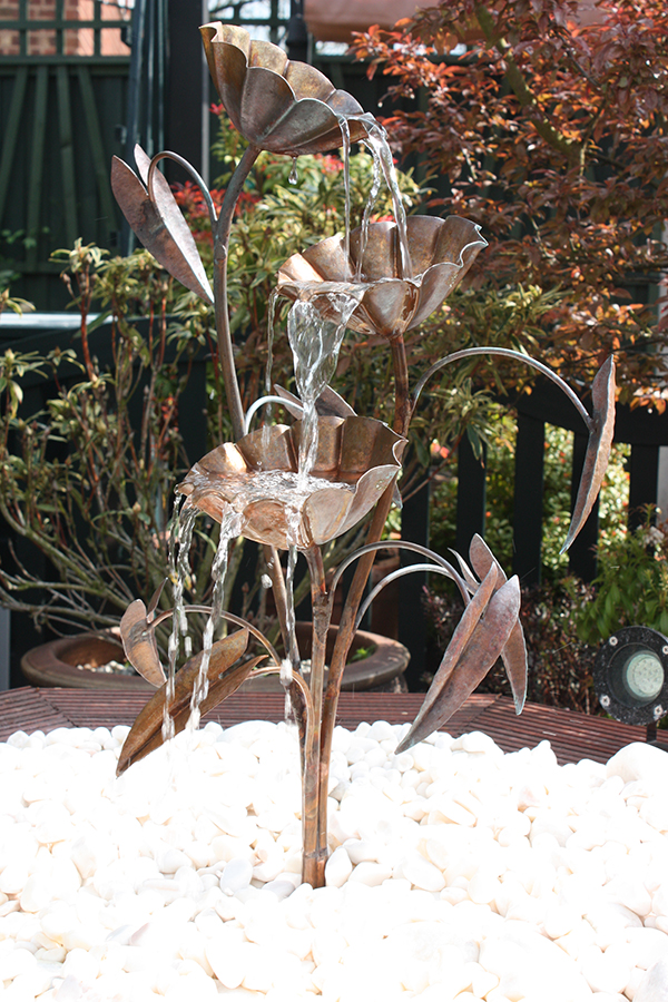 The Morning Glory copper fountain cascades water from flower to flower. Acting as bowls, the water wells inside the blooms, spilling from one fto another.