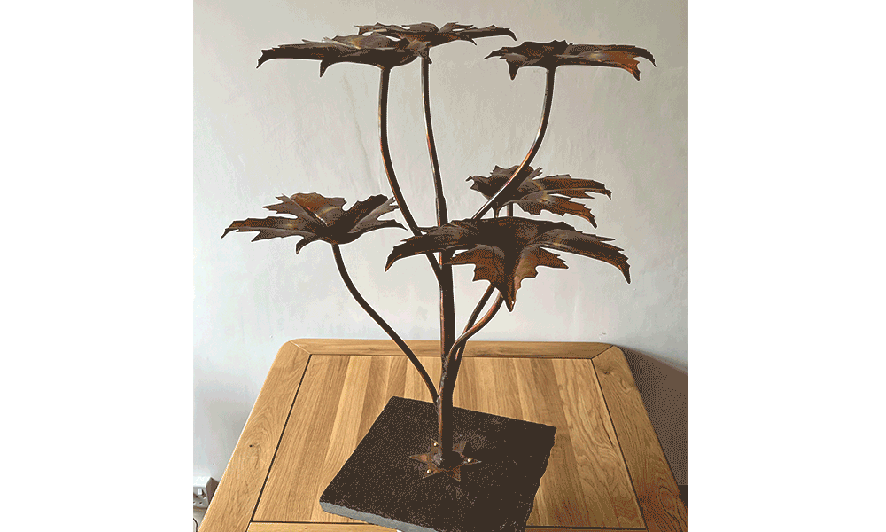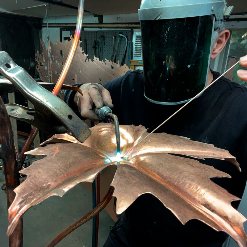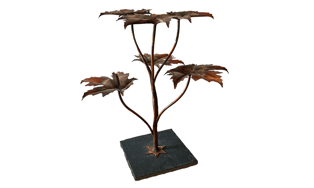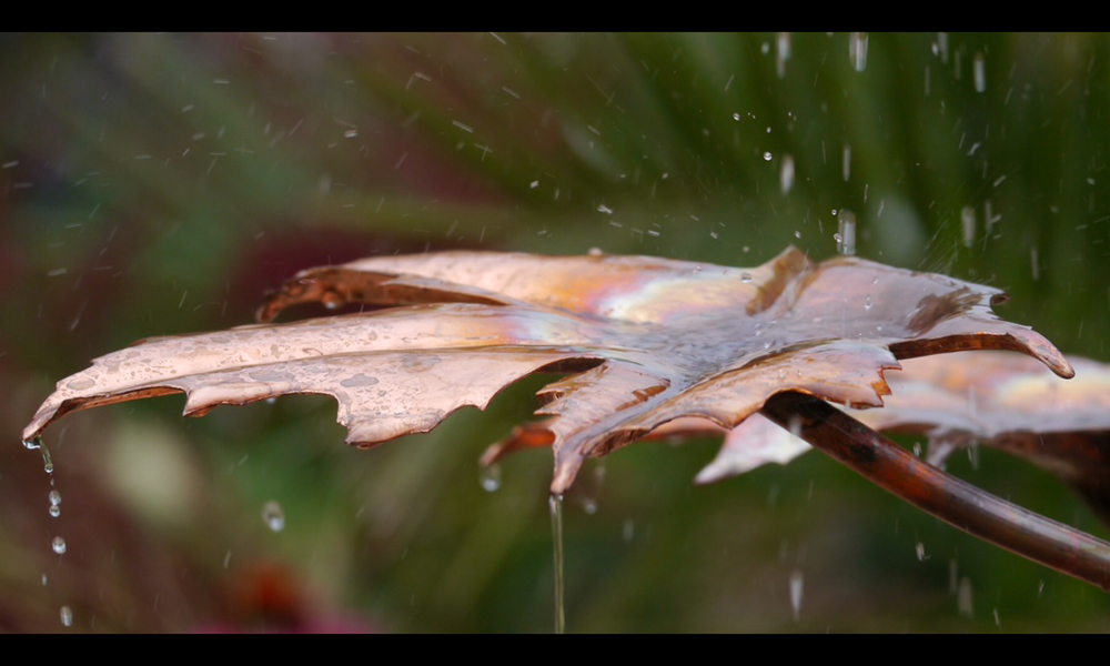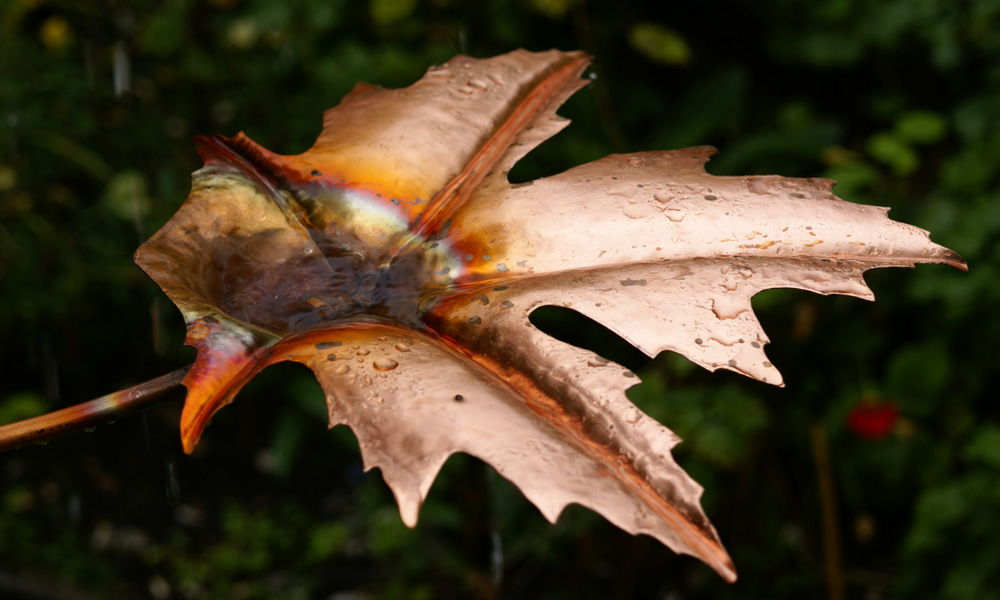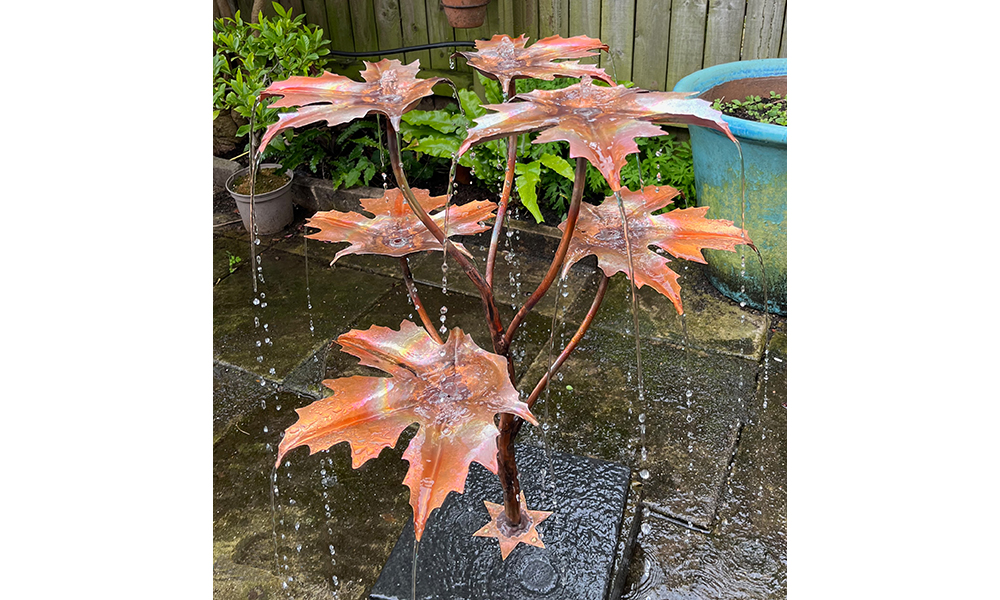 The Norway Maple copper fountain was one of the first fountain designs produced by Gary around 2001. With its deeply worked leaves, water cascades beautifully from the tips, creating lots of small streams.