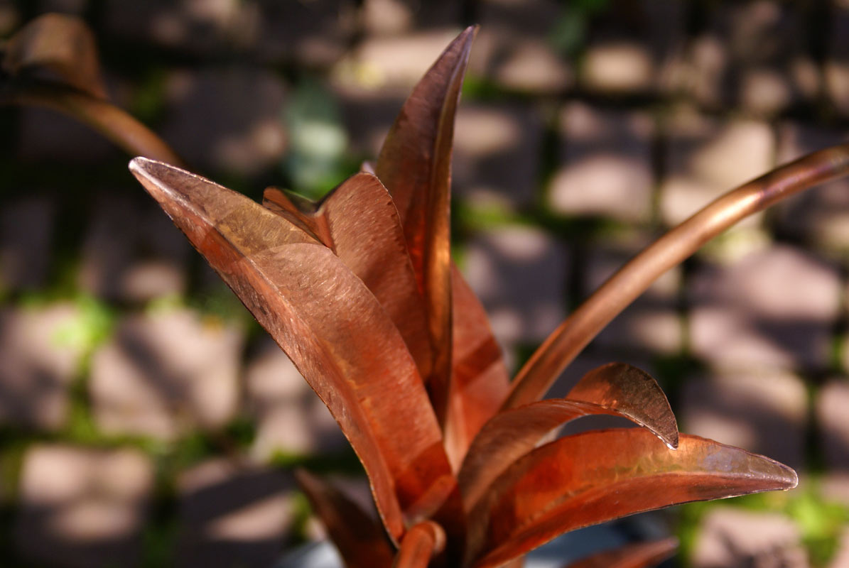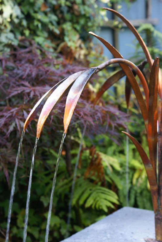 A hand-beaten copper fountain with three arching branches, neatly directing the flow of water over the leaves at each end. This fountain looks very natural in a pond and creates a lovely, gentle background sound of trickling water. As with all of our fountains, the copper will quickly take on a dark patina, which can further develop tinges of verdi-gris green at the edges. This process continues over many decades and continually improves the appearance of the piece.