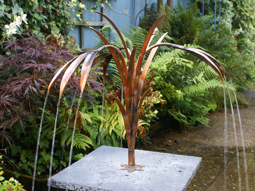 The copper is intentionally left natural and uncoated, to benefit from the constant changing patinas building up over many decades. This process allows the fountain to blend perfectly into a garden, integrating, without dominating.